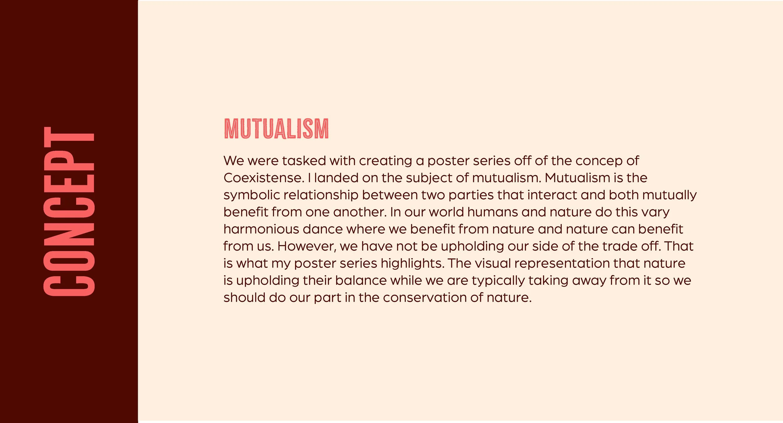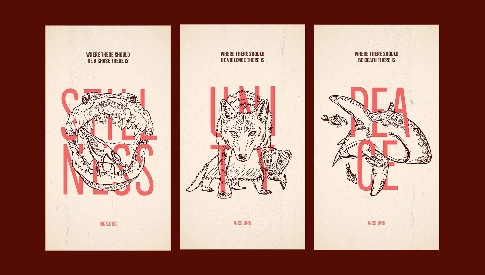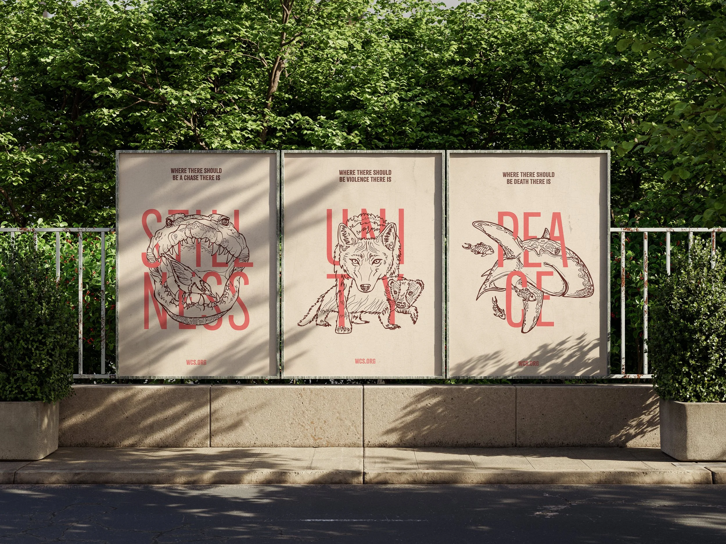 Wildlife Avocational Poster series This project was a design campaign for the Wildlife Conservation Society. The conceptual theme for the poster series was the topic of mutualism. How creatures who should be at odds work together in harmony, coexisting for the benefit of themselves. In the same way we as humans should do our part to protect and preserve wildlife in the mutual benefit for them and our world. Poster Campaign - Fall 2025 PROJECT DETAILS: