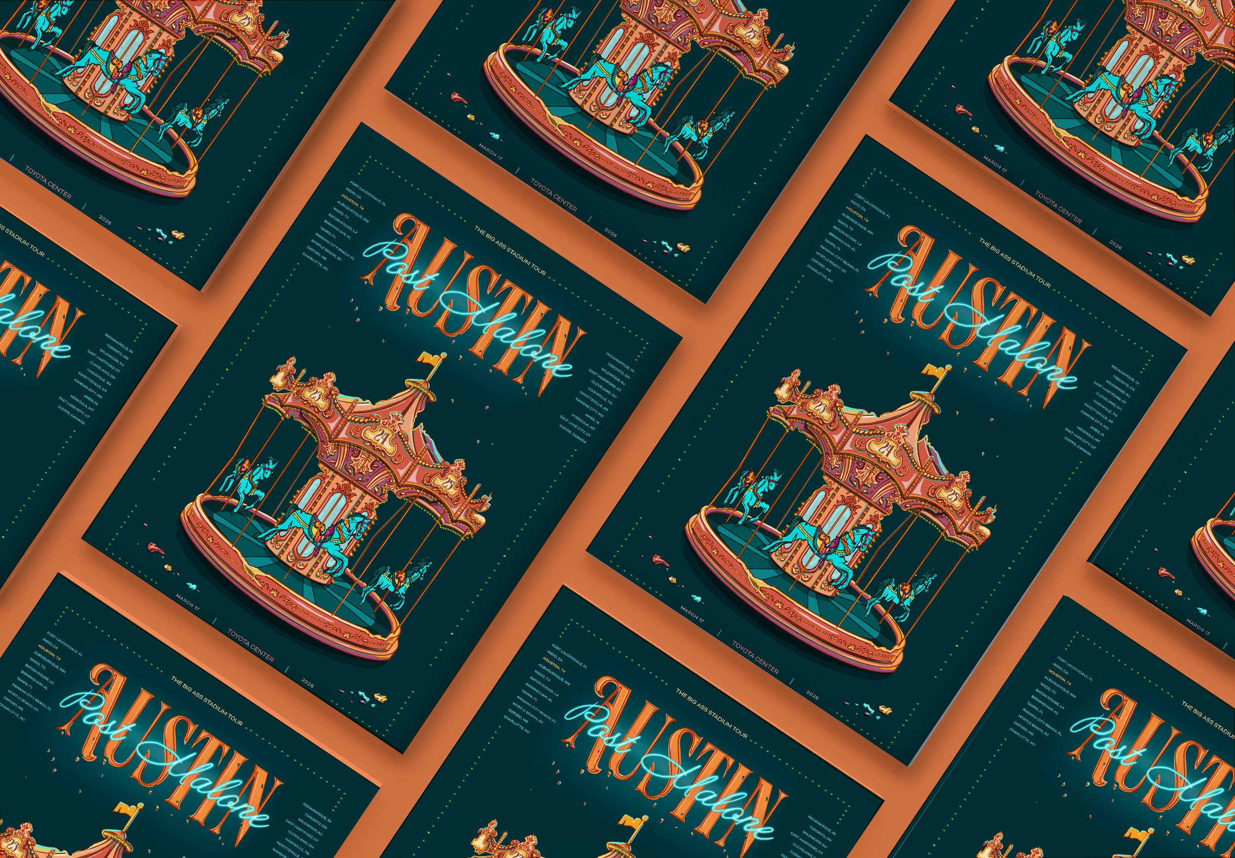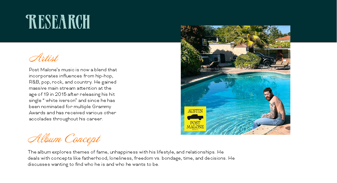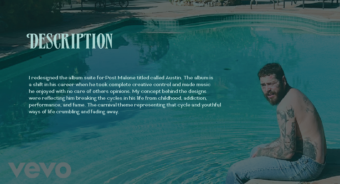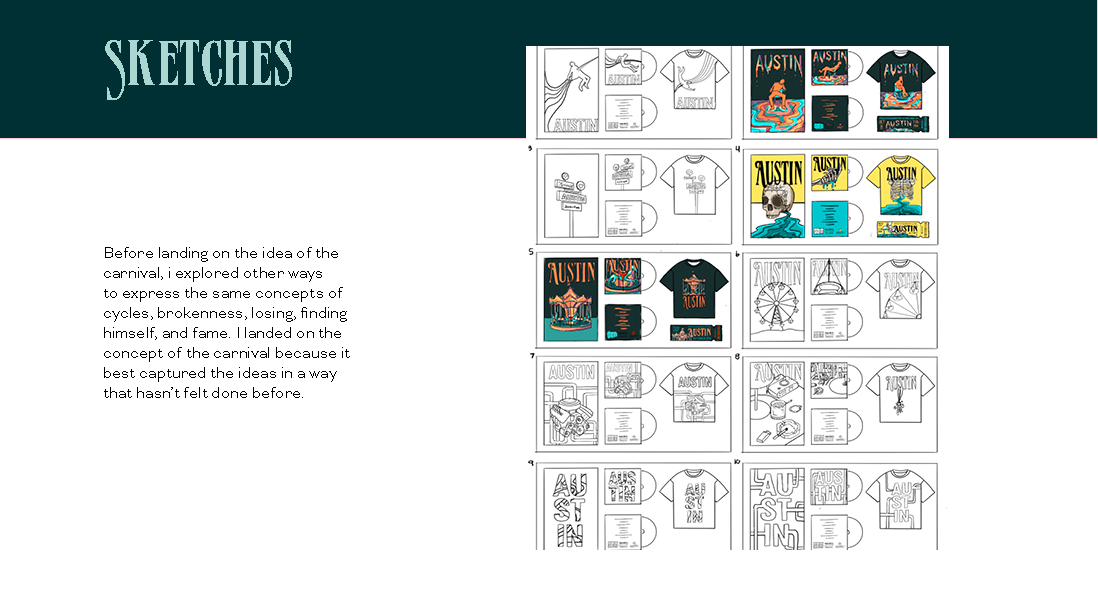 Album Campaign Design for Post Malone This project was a design campaign for Post Malone’s album Austin. The themes of the album include letting go of your younger self, breaking cycles, addiction, and loneliness. I designed a concept centered around the carnival atmosphere to symbolize a younger spirit that held cycles which no longer can be sustained and the result of that abandonment . Album Campaign - Fall 2025 PROJECT DETAILS: