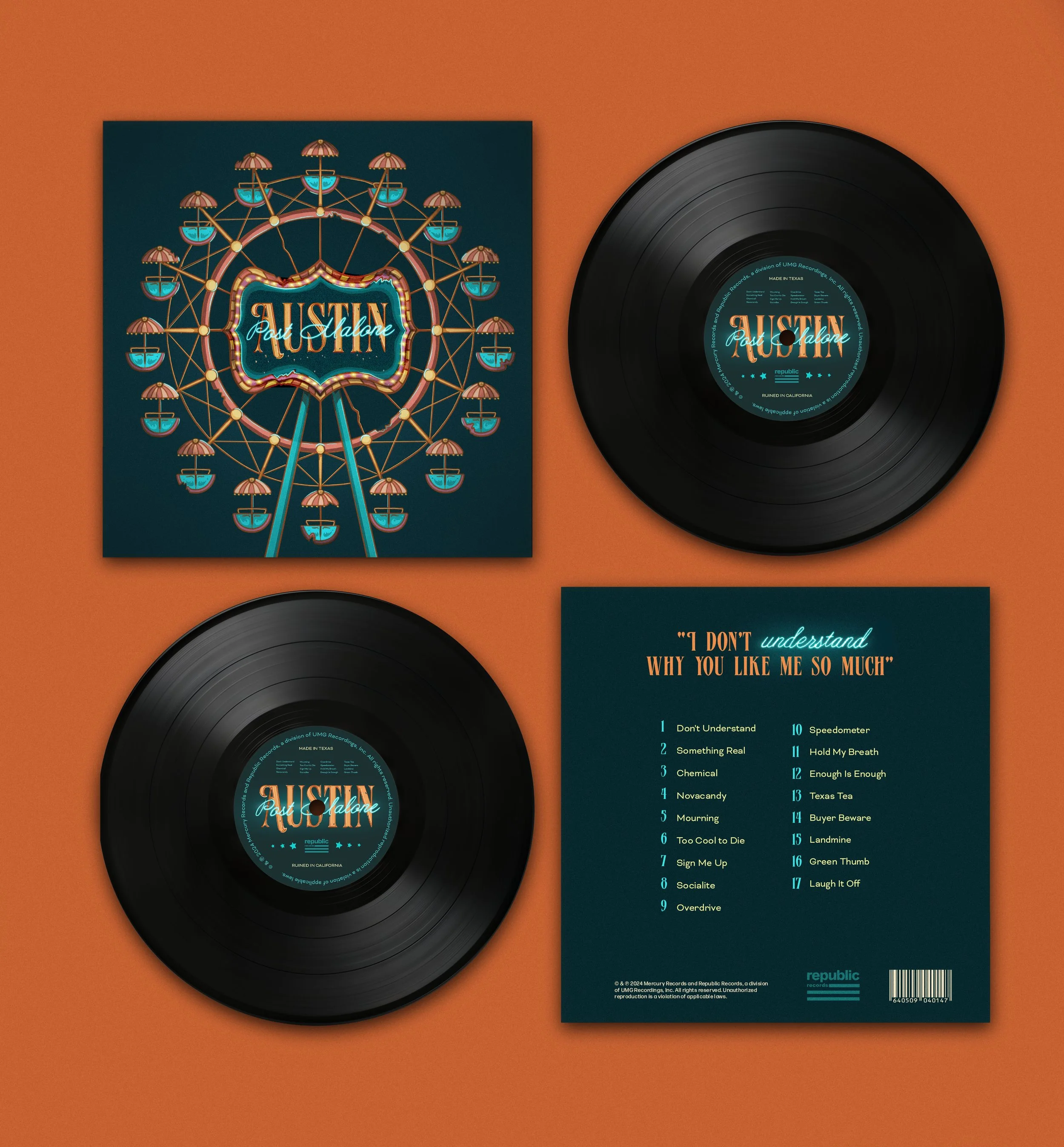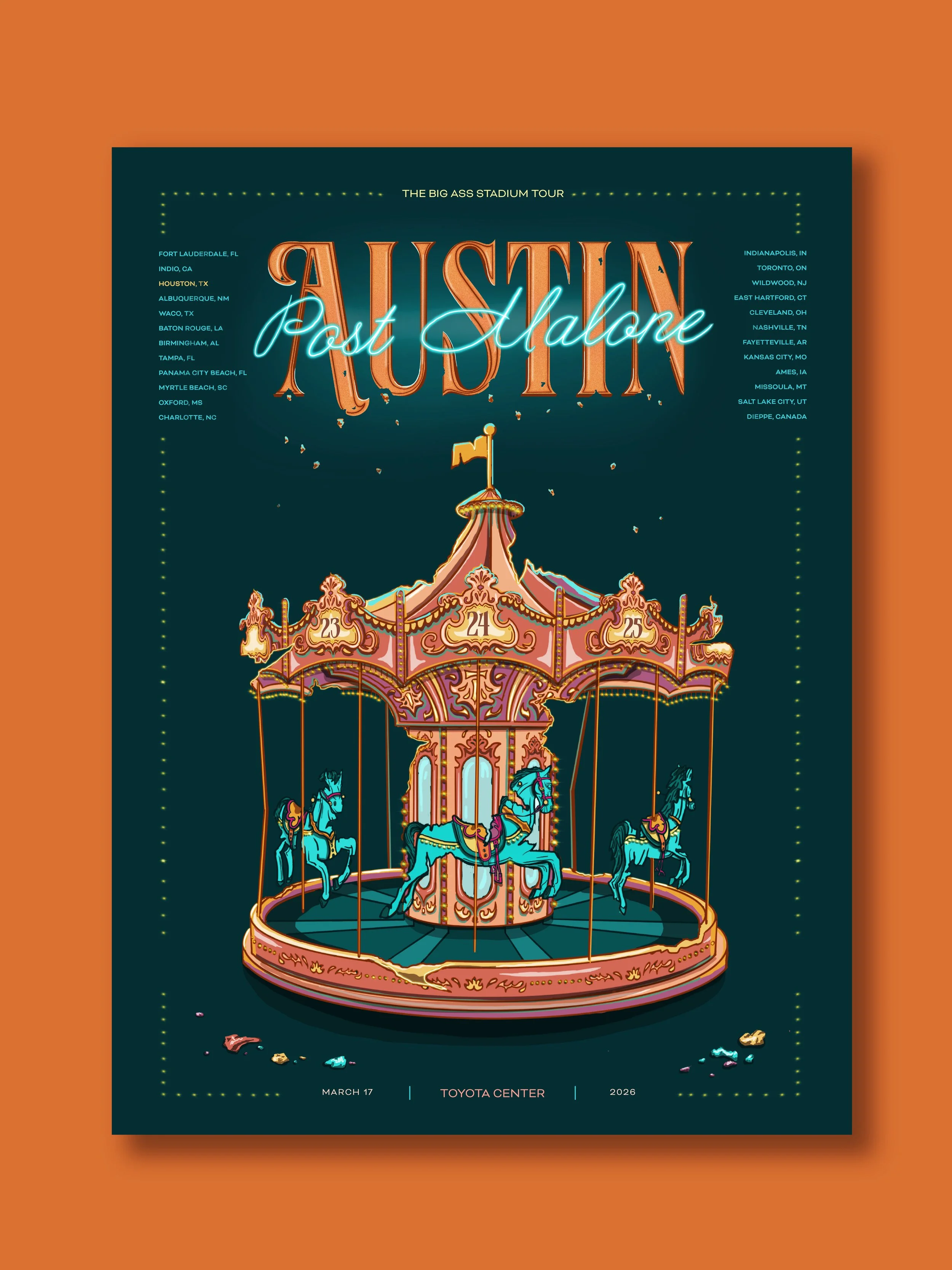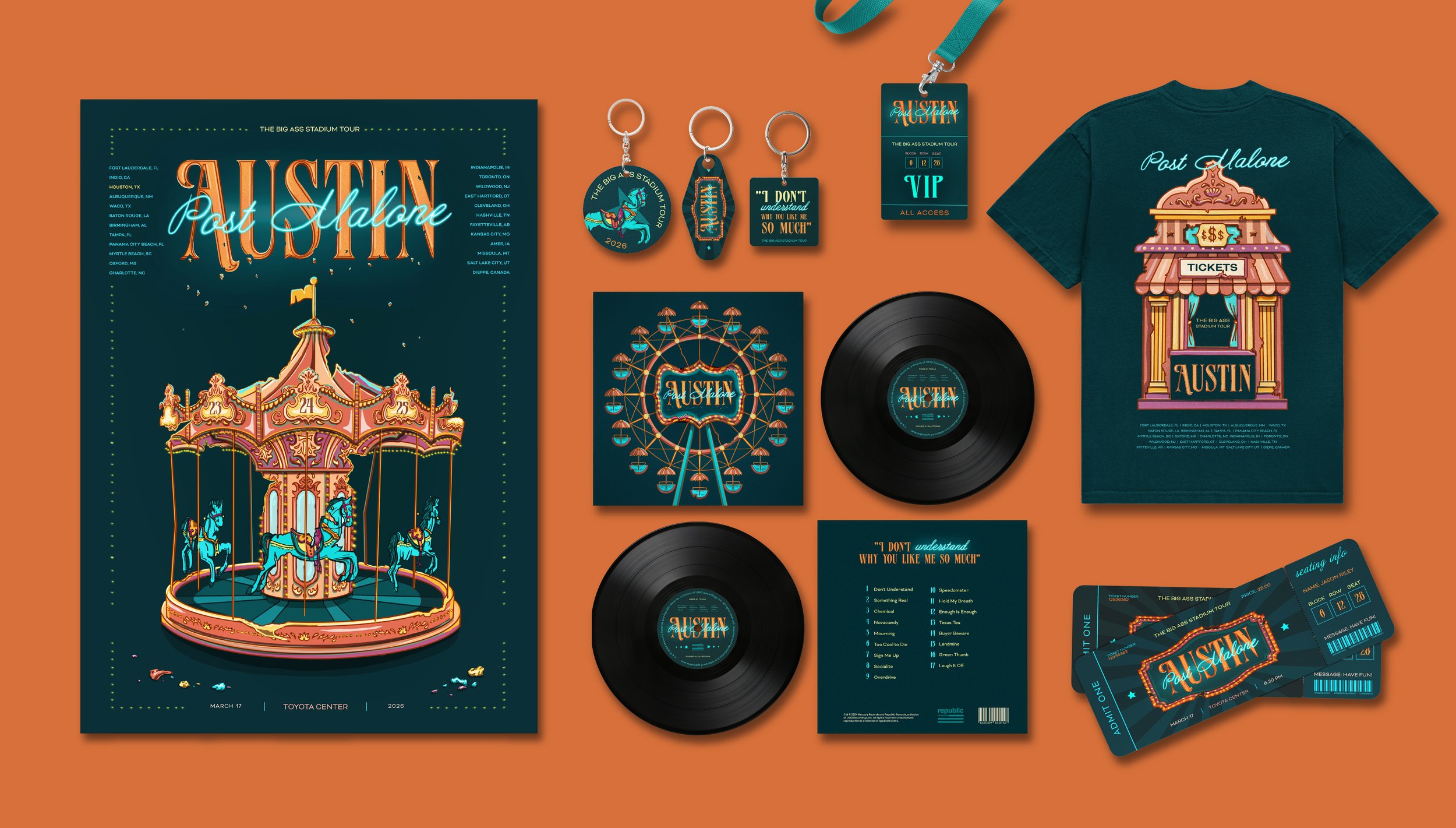 Album Campaign Design for Post Malone This project was a design campaign for Post Malone’s album Austin. The themes of the album include letting go of your younger self, breaking cycles, addiction, and loneliness. I designed a concept centered around the carnival atmosphere to symbolize a younger spirit that held cycles which no longer can be sustained and the result of that abandonment . Album Campaign - Fall 2025 PROJECT DETAILS: